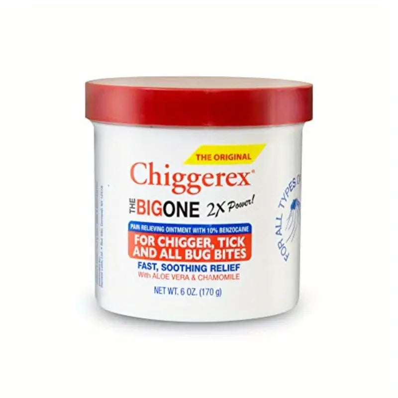 Get quick, powerful relief from itchy bug bites with Chiggerex 2X Power Ointment. This maximum strength formula contains 10% Benzocaine to numb pain and stop itching on contact. Enriched with Aloe Vera and Chamomile, it soothes skin irritated by chiggers, mosquitoes, ticks, spiders, and other insects.
